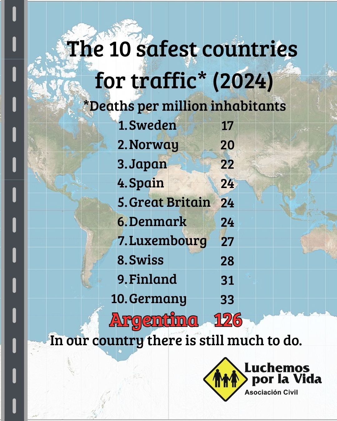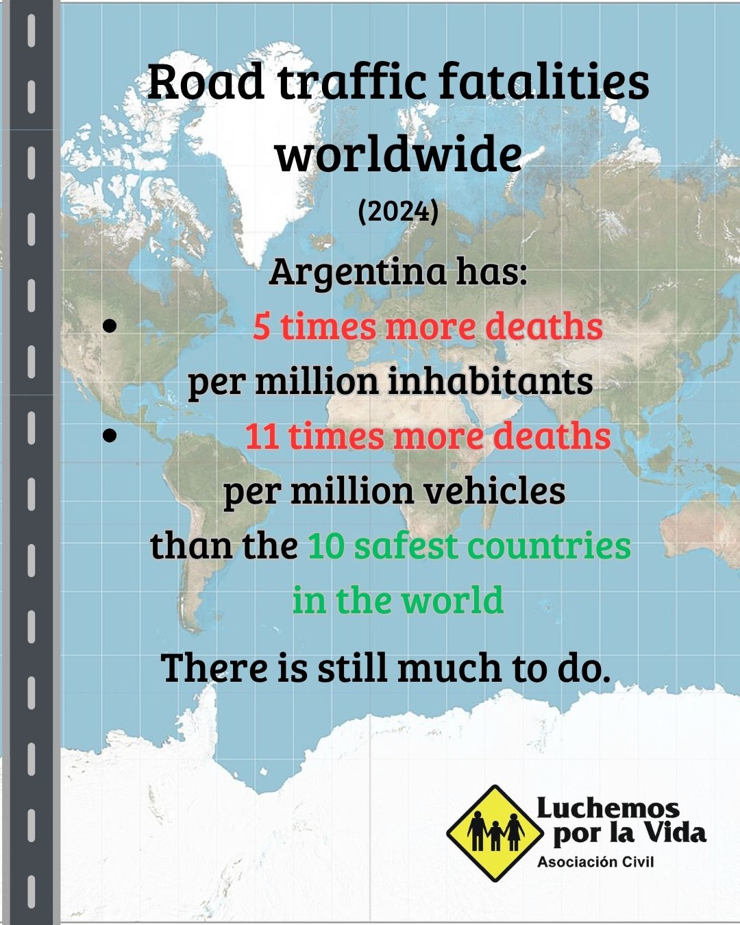 According to road traffic fatality statistics collected by Luchemos por la Vida worldwide, Argentina has 5 times more deaths per million inhabitants and 11 times more deaths per million vehicles than the 10 safest countries in the world.