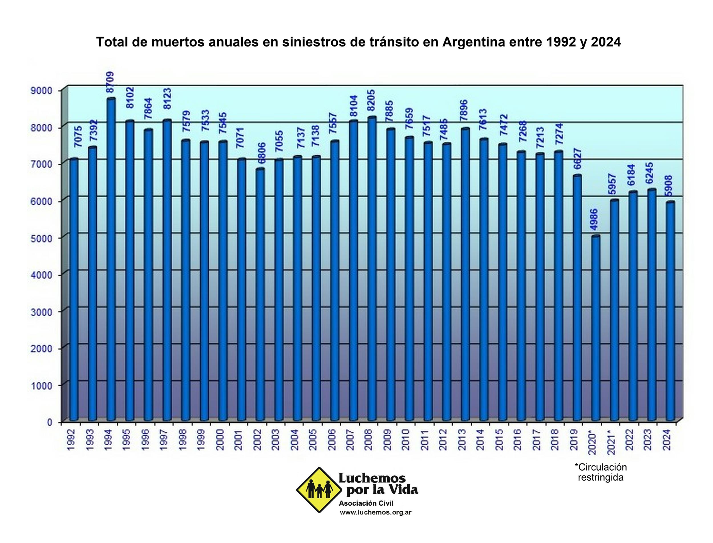 Total de muertos anuales en siniestros de tránsito en Argentina entre 1992 y 2024
