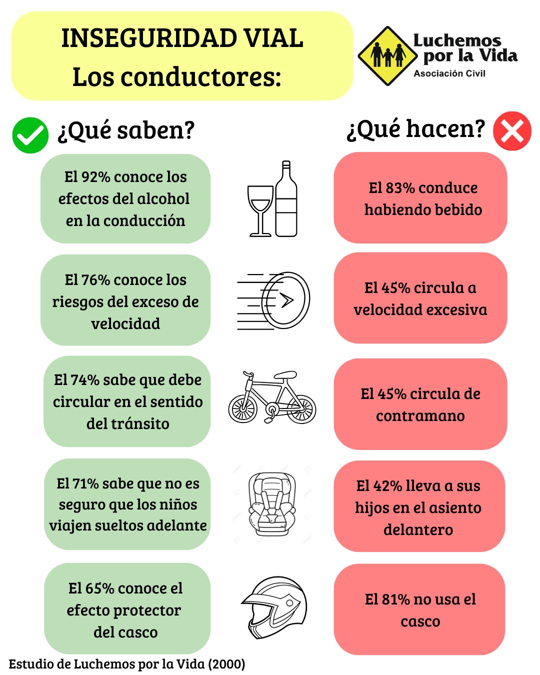 Un estudio difundido esta semana por la AACS corroboró una realidad ya estudiada hace más de 25 años por Luchemos por la Vida, que la mayoría de las personas conoce las normas de tránsito, pero no las respeta. En el año 2000, Luchemos por la Vida publicó internacionalmente un estudio basado en 618 encuestas y miles de observaciones sistemáticas de comportamientos, y llegaba a la misma conclusión.